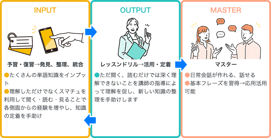 e-Learningのスマチュと、スクールで使用する教材への内容がリンクしているレッスンで学んだことをすぐに復習・アウトプットすることが可能 |